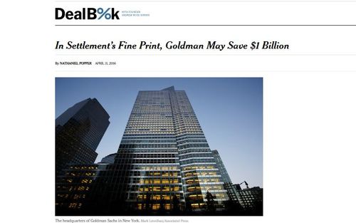 Goldman Mortgage Settlement Is Much Less Than Meets the EyeGoldman’s market capitalization is $64 billion, so this is just a cost of doing business. No individual executives are going to jail or will face civil liability. We’re not barbarians like back in the early 1990s when over 1,000 financial executives were convicted in the savings & loan mess.By NATHANIEL POPPER APRIL 11, 2016