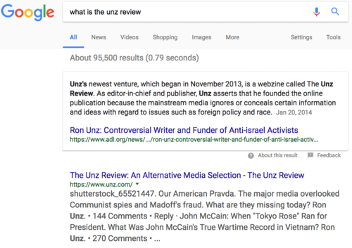 The good news is that Google’s Boxed Warning from the Anti-Criticism League probably doesn’t much matter because if you type in “unz review” (instead of “what is the unz review”) you’ll get the, you know, Unz Review as the first choice and the ADL’s warning about the Unz Review having cooties as only the fifth choice. But still …