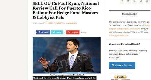 SELL OUTS: Paul Ryan, National Review Call For Puerto Rico Bailout For Hedge Fund Masters & Lobbyist Pals, by Charles C. Johnson, April 21, 2016