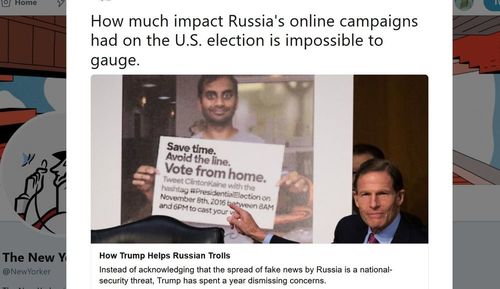 “At a congressional hearing this week, Senator Richard Blumenthal displays an example of fake news disseminated by a Russian social-media account.” — The New Yorker