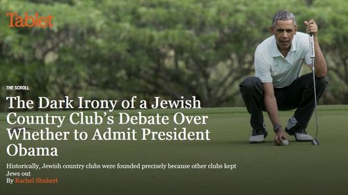 THE DARK IRONY OF A JEWISH COUNTRY CLUB’S DEBATE OVER WHETHER TO ADMIT PRESIDENT OBAMAOf course, a funny but forgotten fact is that many Jewish country clubs (such as Sunningdale in Westchester County) were founded by Eastern European Jews precisely because German Jewish country clubs (such as Century) blackballed them as “orientals.” Heck, even in Birmingham, Alabama, the local Jews supported two ethnically divided Jewish country clubs until they finally broke down and merged in 1969.Historically, Jewish country clubs were founded precisely because other clubs kept Jews out