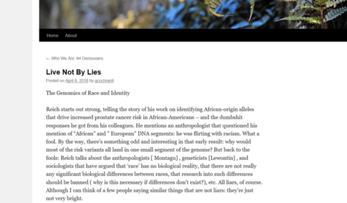 Reich mentions independent genome bloggers [Reich specifically mentions in his book Razib and Dienekes], some of them skilled analysts, who are on the whole less inclined to go along with the usual falsehoods. He thinks that means you can’t keep up the charade: again, he’s very likely wrong, not least because those skilled genome bloggers have a tiny audience. More important, Reich himself doesn’t want to keep up the charade. That may matter.