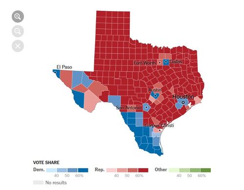 Texas’s 38 electoral votes went to Donald Trump in the 2016 election, with 53 percent of the popular vote. Hillary got 43, so perhaps it’s not over for Anglos in Texas. But it’s worth noting the shape of the electoral map: