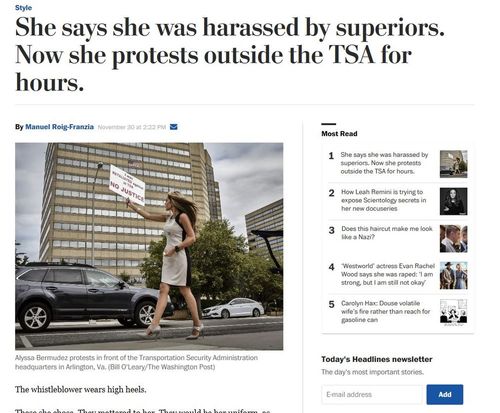 Now, why was Bermudez in the Post? Because she is staging a protest in a tight dress and spiked heels protesting sexual harassment during her employment at the Transportation Security Administration.