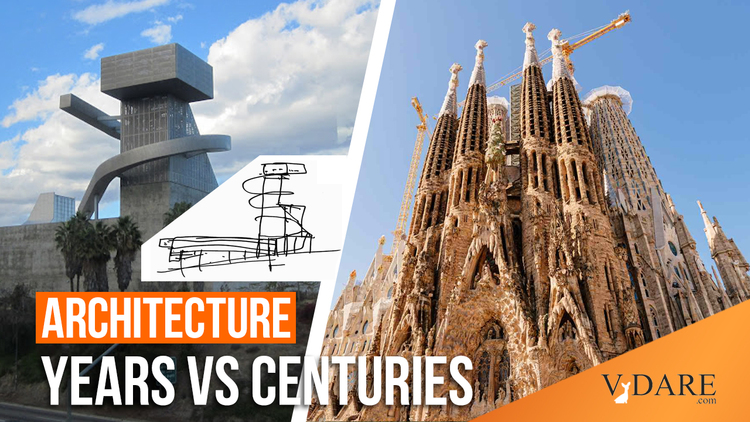 In contrast, European cathedrals typically take centuries to finish. Even the most beloved piece of high aesthetic architecture of recent generations, Barcelona’s church of the Sacred Family, designed by Gaudi and currently paid for by an immense number of tourists chipping in $20 bucks to have a look around, has been under construction since 1882. The plan is to wrap it up by the 100th anniversary of Gaudi’s death in 2026. But we’ll see if that happens.