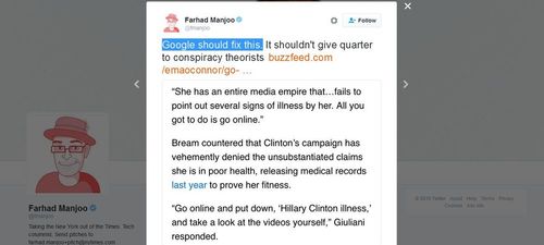 Hillary Clinton's health is something that you're not allowed to discuss. When Rudy Giuliani surfaced concern about it, New York media bigfoot Farhad Manjoo said Google should suppress search results for signs of Hillary's bad health: