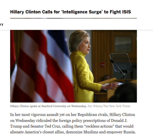 Hillary Clinton Calls for ‘Intelligence Surge’ to Fight ISISNever let a crisis goes to waste.By Amy Chozick, 3/23/16