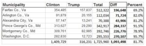 (The 81.7% is a truly astonishing number, even taking demographics, etc., into account … Adding in the counties a little farther out — also with many federal employees, contractors, etc. — would lower the percentage, but raise the total vote difference …)