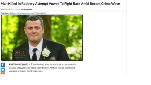 Amid a rash of crimes in South Baltimore, Alexander Wrobleski recently told co-workers that if he was targeted, he wouldn’t go down without a fight.At some point in the not too distant future, the wrong white man is going to be the attempted victim of a mugging/robbery by black suspects.On Tuesday morning, Wrobleski stared down a robber’s handgun and resisted — and lost his life.