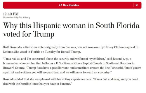 “I’m a realist, and I’m concerned about the security and welfare of my children,” said [Ruth] Rosendo, 31, a homemaker who cast her first ballot as a U.S. citizen at Grace Baptist Church in Southwest Ranches in Broward County. “Trump does have a peculiar tone and sometimes crosses the line,” she said, “but if you’re a patriot and a citizen you will see past that, and we will move forward as a country.”