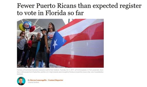 Fewer Puerto Ricans than expected register to vote in Florida so farHispanics just don’t hate white people enough for the Democratic strategists. So, bring on the Muslims!Steven Lemongello