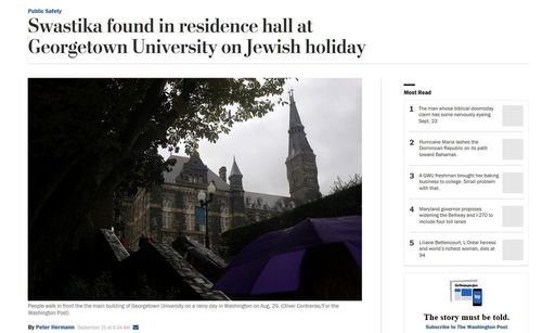 Authorities at Georgetown University are investigating a swastika found painted inside a residence hall restroom on Wednesday evening, at the start of Rosh Hashanah, the Jewish high holy season marked by a period of repentance and atonement.I’m going to assume that DeGioia is including any leftist Antifa or Black Lives Matter activist if the “hate crime” turns out to be a hoax.John J. DeGioia, president of the Catholic university, sent an email to students Wednesday night saying, “We have been confronted with an abhorrent act of anti-Semitism.” He said the symbol was “accompanied by threatening and derogatory language advocating for violence against women. ...”