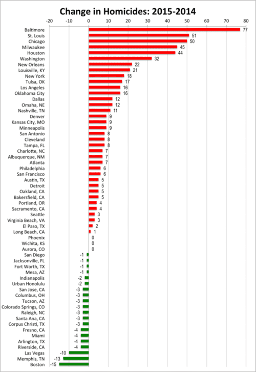 Summing across all 59 cities, homicides were up 16%. That’s a scary 482 more dead bodies so far in 2015 v. 2014.