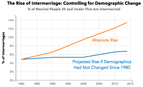 In other words, changing beliefs is responsible for only a fraction of the increasing intermarriage rate.