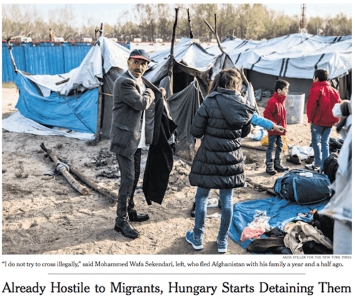Already Unwelcoming, Hungary Now Detains Asylum Seekers, New York Times, April 18, 2017HORGOS, Serbia — Double rows of razor-wire fences. High-tech watch towers equipped with search lights, motion sensors, cameras and loudspeakers. Hungary’s border with Serbia, specially fortified in the last two years to keep out migrants and refugees, is anything but a welcome mat.