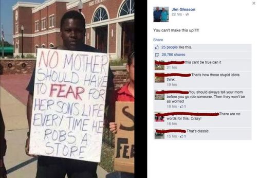 I had to took, because I wanted to see what these people think is awful. Here's the "racist" meme: "No mother should have to fear for her son's life every time he robs a store". The original poster says "You can't make this stuff up." but you can—it's Photoshopped.