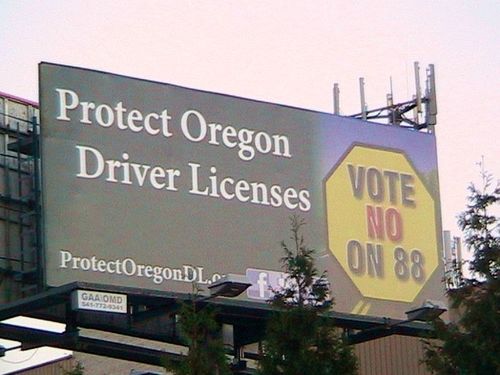 Cynthia tells me that Highway 26's heavy traffic means it's often slow going along this stretch, so many Oregon motorists will get a leisurely view of the 12-foot by 28-foot billboard—lit from dusk until dawn—with its starkly simple message: Vote against giving "driver cards" to illegal aliens residing in Oregon.