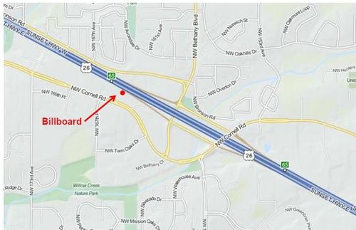The photo above was provided by Cynthia Kendoll, president of Oregonians for Immigration Reform [OFIR]. About 100,000 cars per day pass the billboard, which sits on the south side of highway US 26, about 1/2 mile west of NW Cornell Road in Beaverton (see map below).