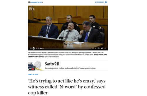 Accused cop killer mouths off again in court, Sacramento Bee, January 18, 2018Luis Bracamontes was ejected from his trial for the third straight day Thursday after he began mouthing off at the partner of the Sacramento sheriff’s deputy he is accused of killing in 2014.