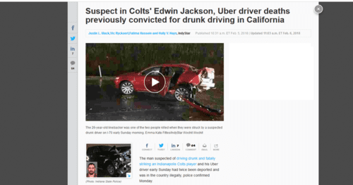 Suspect in Colts’ Edwin Jackson, Uber driver deaths previously convicted for drunk driving in California, Indianapolis Star, February 5, 2018The video report below provides a good description of the crime:The man suspected of driving drunk and fatally striking an Indianapolis Colts player and his Uber driver early Sunday had twice been deported and was in the country illegally, police confirmed Monday.