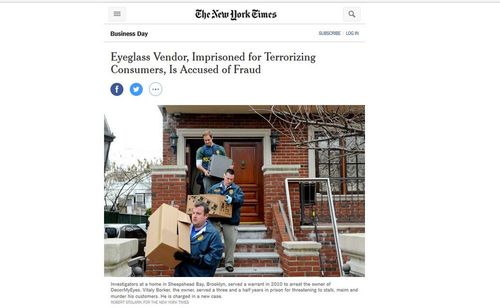 Federal prosecutors in the Southern District of New York announced on Thursday that Mr. Borker had been arrested and charged with wire and mail fraud while running OpticsFast.com, an eyewear site that authorities said hassled consumers mercilessly. …Diveroli’s $300 million Pentagon contract was once a 9 days wonder in the news media that was supposed to bring down Dick Cheney. I predicted, however, that it would just turn out to be Brooklyn camera shop bait-and-switch tactics writ large, and that turned out to be the case.OpticsFast customers told Postal Service inspectors that rather than the luxury brands advertised on the site, they were sold cheap knockoffs, and then badgered and bullied when they asked for refunds. One buyer, a woman in California identified in a criminal complaint as Victim-1, said that someone had called her 35 times a day after she complained online about a fake and damaged pair of Ray-Bans she bought from the site.