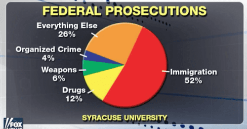 Immigration violations are majority of federal cases for first time, Fox News, November 29, 2016For the first time, immigration violations now make up more than half of all federal prosecutions, easily outpacing drugs, fraud, organized crime, weapons charges and other crimes.