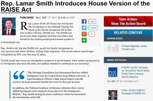 Rep. Lamar Smith (R-Texas) has introduced the Immigration in the National Interest Act, which is the House companion bill to Sen. Tom Cotton’s (R-Ark.) RAISE Act. The RAISE Act would end chain migration and the visa lottery and transform the existing employment-based system to a merit-based one.What’s in it?Rep. Lamar Smith Introduces House Version of the RAISE Act