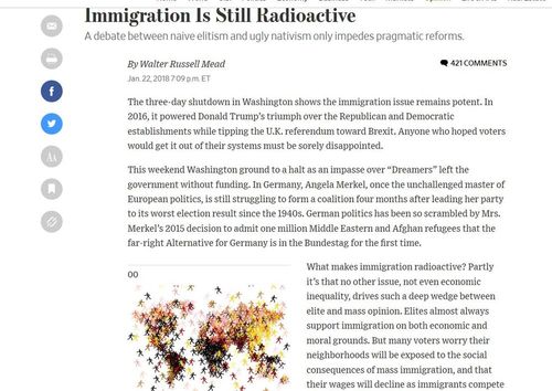 Immigration Is Still Radioactive, By Walter Russell Mead, Wall Street Journal, January 22, 2018A debate between naive elitism and ugly nativism only impedes pragmatic reforms.