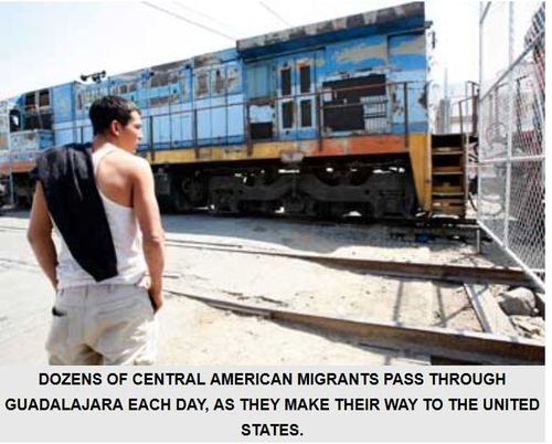The government stepped in to offer FM4 a new property last month after the NGO closed its shelter by the railway tracks, citing security issues for its staff.(Two photographs included, one with a caption reading "Dozens of Central American migrants pass through Guadalajara each day, as they make their way to the United States." The other shows a billboard opposing the placement of the "migrant shelter".)Since the charity opened the shelter in 2010, it has served as a vital stopover for migrants to rest, eat, shower and seek advice as they made their way to the United States - mostly by hopping on northbound cargo trains.