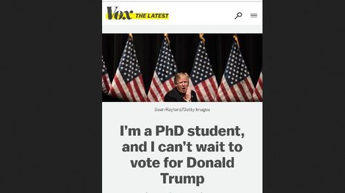 There's a very powerful and brave post at VOX today (April 4): I’m a PhD student, and I can’t wait to vote for Donald Trump, by [NAME REDACTED BECAUSE I TURNED OUT TO BE RIGHT--pb, 3/18/2019], who actually is (or was as of this morning—I don't share his cheerful optimism) a Ph.D. student at the University of Indiana. It should be read in full because it makes many significant points, but this passage particularly warmed our hearts here at VDARE.com: