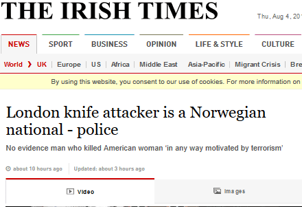 London knife attacker is a Norwegian national - policeEven the Irish Times managed to mention thatNo evidence man who killed American woman ‘in any way motivated by terrorism’