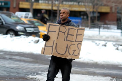 “I give out free hugs,” he explained, “to make people stay better.” When somebody wants a picture of a hug in progress, he asks for a dollar in return, shoving the bills into a back pocket.