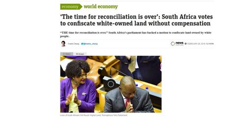 ‘The time for reconciliation is over’: South Africa votes to confiscate white-owned land without compensationNow, Cyril Ramaphosa didn’t develop a personal net worth of $450 million by terrifying “white monopoly capital” so I’m not sure how seriously to take this.Frank Chung@franks_chung news.com.au FEBRUARY 28, 201812:11PM