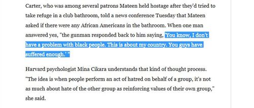 Carter, who was among several patrons Mateen held hostage after they’d tried to take refuge in a club bathroom, told a news conference Tuesday that Mateen asked if there were any African Americans in the bathroom. When one man answered yes, “the gunman responded back to him saying, ‘You know, I don’t have a problem with black people. This is about my country.* You guys have suffered enough.’”