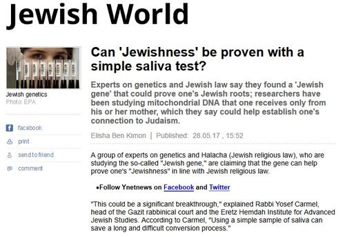 Can ‘Jewishness’ be proven with a simple saliva test?[Comment at Unz.com]Experts on genetics and Jewish law say they found a ‘Jewish gene’ that could prove one’s Jewish roots; researchers have been studying mitochondrial DNA that one receives only from his or her mother, which they say could help establish one’s connection to Judaism.