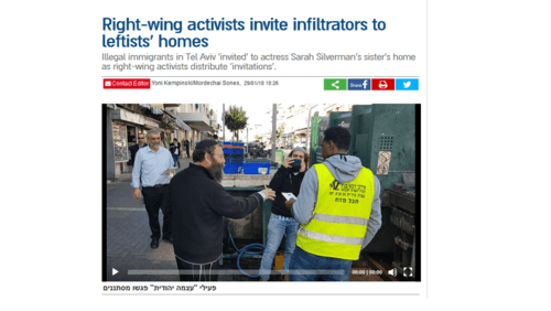 Right-wing activists invite infiltrators to leftists’ homesThis is very funny, but I’m totally against giving out private addresses, no matter how much they might deserve it. Bad things can spiral out of the control and expectations of the pranksters.Illegal immigrants in Tel Aviv ‘invited’ to actress Sarah Silverman’s sister’s home as right-wing activists distribute ‘invitations’.