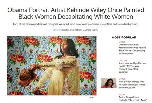 Obama Portrait Artist Kehinde Wiley Once Painted Black Women Decapitating White Women, The Wrap,February 12, 2018With his rendering of President Barack Obama, Kehinde Wiley became the first African American to ever paint an official presidential portrait, but the new-found fame has also drawn attention to some of the artist’s more boundary-pushing past works.