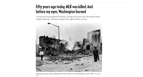 Fifty years ago today, MLK was killed. And before my eyes, Washington burnedI witnessed unprecedented looting, rioting and arson that destroyed about 1,000 buildings. Thirteen people died, eight of them in fires