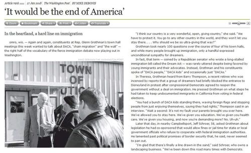 Forget Senate negotiators — House conservatives could have the last word on immigration, Washington Post, January 26, 2018OMRO, Wis. — Again and again, constituents at Rep. Glenn Grothman’s town hall meetings this week wanted to talk about DACA, “chain migration” and “the wall” — the right half of the vocabulary of the fierce immigration debate now playing out in Washington.