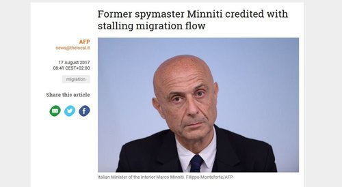 Former spymaster Minniti credited with stalling migration flowThe modern state that emerged in Europe over the last few hundred years can be quite powerful when it feels like it, as Minniti’s rapid accomplishments have demonstrated. Here in the U.S., we think of the Secretary of the Interior as a semi-comic figure in charge of stopping Yogi Bear from swiping picnic hampers, but in the rest of the world the Minister of the Interior is The Crackdown.AFP 17 August 2017