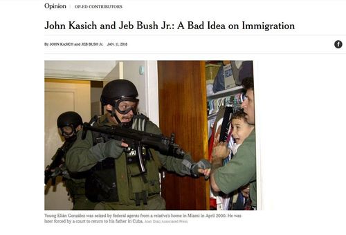 John Kasich and Jeb Bush Jr.: A Bad Idea on ImmigrationI can recall sitting at a dinner table in late 1999, with a former Lt. Governor who wanted to talk about the Elian Gonzalez case. She turned to Gen. William Odom, head of the NSA under Reagan, and asked him what he thought of the case. The General replied, “It is of trivial importance.”By JOHN KASICH and JEB BUSH Jr. JAN. 11, 2018