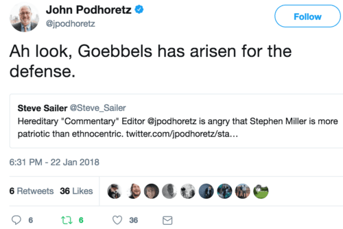 Update from a few minutes ago: Evidently, to Podhoretz, my defending Stephen Miller and joking about Harvey Weinstein makes me “basically a Nazi:”