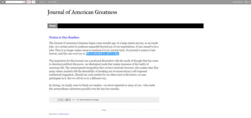 The Journal of American Greatness began some months ago, to a large extent anyway, as an inside joke. At a certain point its audience expanded beyond any of our expectations. It also ceased to be a joke. Thus it no longer makes sense to continue it in its current form. No journal is meant to last forever, and this one won’t try to. We’ve decided to call it a day.The wording of this statement is perplexing, for even though the title JAG is obviously tongue-in-cheek, and despite amusing satires by the writer who called himself Plautus, JAG was deadly serious. My guess: this Notice to Readers is meant to create plausible deniability for the authors, likely after the accusations of racism they received after defending Trump’s statements about Judge Curiel.
