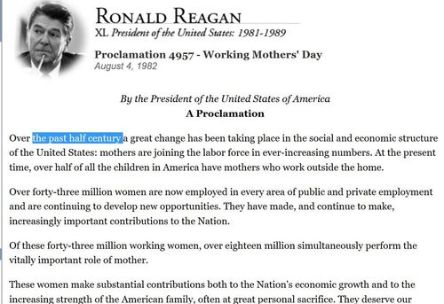 Ronald Reagan working mothersthe first thing I get is is a very nice looking Proclamation by President Reagan declaring August 4, 1982 to be Working Mothers Day. This was totally non-controversial at the time