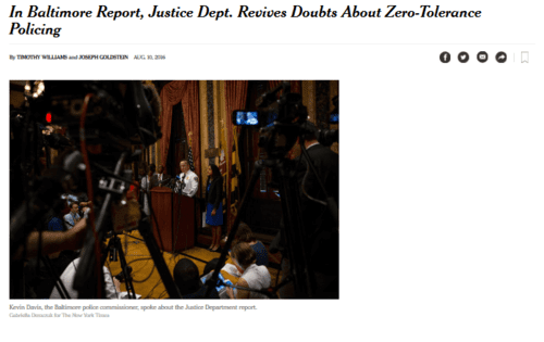 In Baltimore Report, Justice Dept. Revives Doubts About Zero-Tolerance PolicingThus, the Obama Administration has targeted its wrath upon influential metropolises like Baltimore and Ferguson, while leaving alone obscure podunkvilles like New York City. If any important people lived in New York, the Obama Administration would no doubt be all over its case for Bill Bratton’s over-zealous crime-fighting, but Ferguson and Baltimore are naturally much higher priorities.By TIMOTHY WILLIAMS and JOSEPH GOLDSTEIN AUG. 10, 2016