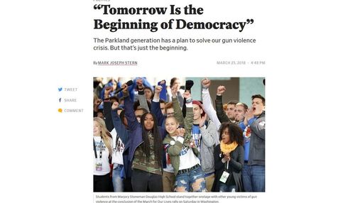 The Parkland kids recognize that they cannot resolve America’s gun emergency without fixing its democracy, as well. On Saturday, they spoke about the vital importance of the right to vote, to demand access to the ballot and fair representation. Many kids affected by gun violence do not get to confront their representatives face to face, because those representatives feel they can ignore them with impunity. Their communities have often been gerrymandered into political irrelevance or effectively disenfranchised by voter suppression laws. Much like the gun lobby’s outsized influence in Congress warps democracy, so do routine attacks on suffrage. Some Americans may have grown numb to the attack on voting rights, or skeptical about the power of their vote. But the Parkland kids refuse to relinquish their democracy.Maybe, but looking at the photo that accompanied the story, no one should think this bunch of geeks, freaks, sissies and weirdos could manage a two-car funeral, much less “fix democracy.”