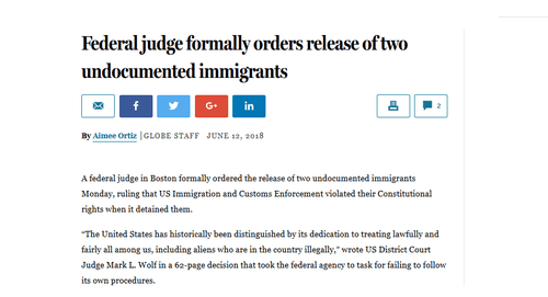 [Federal Judge Formally Orders Release Of Two Undocumented Immigrants, by Aimee Ortiz, Boston Globe, June 12, 2018]