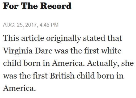 The online version now says "named after Virginia Dare, the first British child born in America" with the correction below.