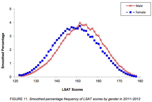 Women who take the LSAT average about a quarter standard deviation lower than men who take the LSAT. When you get out to the Top 14 law schools, that’s starting to make a noticeable difference.