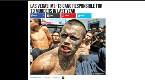 Las Vegas: MS-13 Gang Responsible for 10 Murders in Last Year, Breitbart.com, March 26, 2018The violent El Salvadorian MS-13 gang is responsible for at least ten murders in Clark County, Nevada, Sheriff Joe Lombardo announced on Monday.